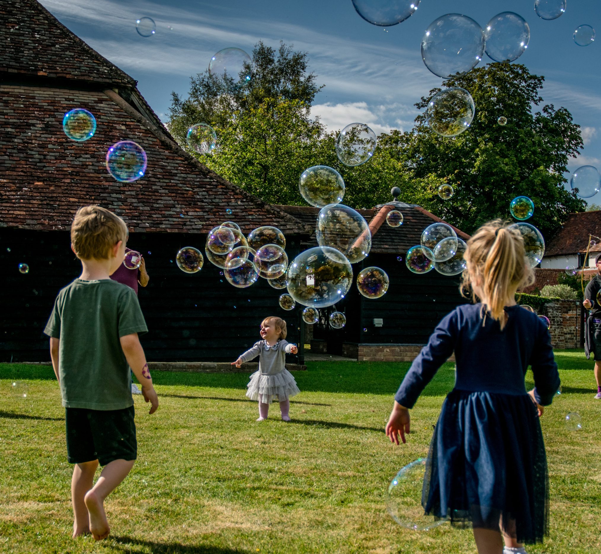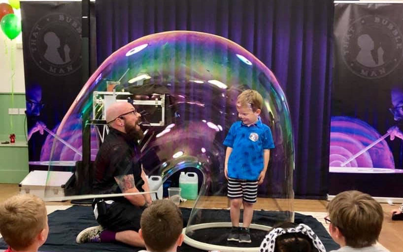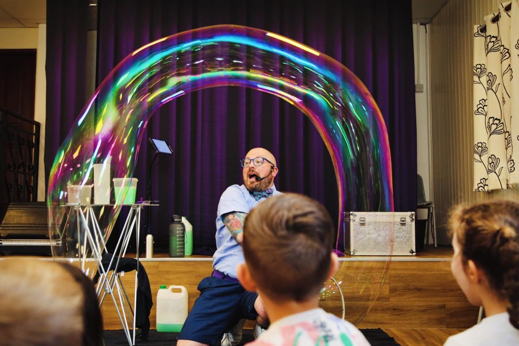 I offer a number of different Bubble options for different ages and scenario's. These range from a Full 2 hour Party Package including Games, competitions and Music to a 50 Minute Family Bubble Show. I can also offer a smaller set up In House Bubble Show or a Bubbletots show specifically made for the 2.5-4 year olds.